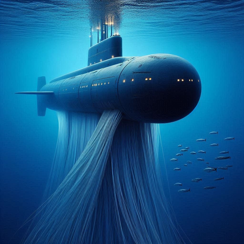 Such a vessel may be towed into position, submerged, then maintain position in the water column via automated buoyancy control. It would only have to loiter 200 feet down to be totally immune to storms. The robots themselves, working miles below, would be teleoperated over fiber optic cables from the submarine.