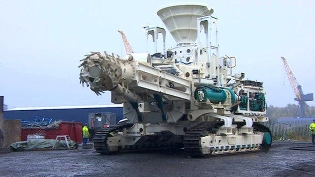 The ones in use today are quadrupedal or tracked and use a bucket wheel excavator to carve up the vents, essentially deep sea volcanoes, and a suction hose to transport the ground up mineral slurry to the surface vessel for processing.